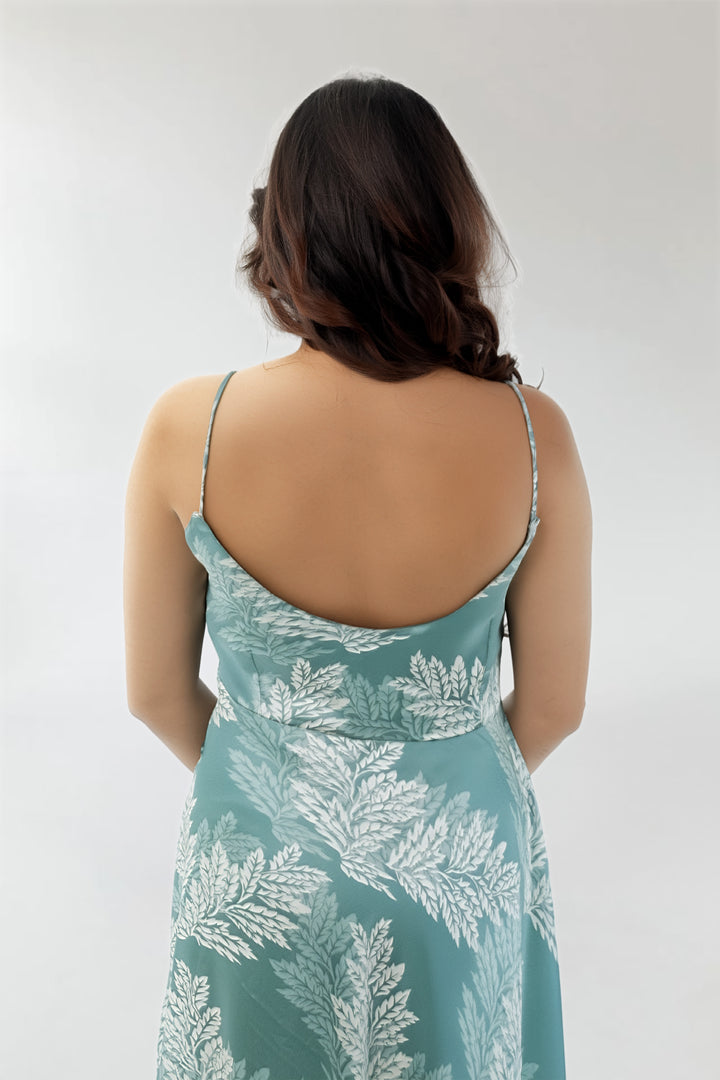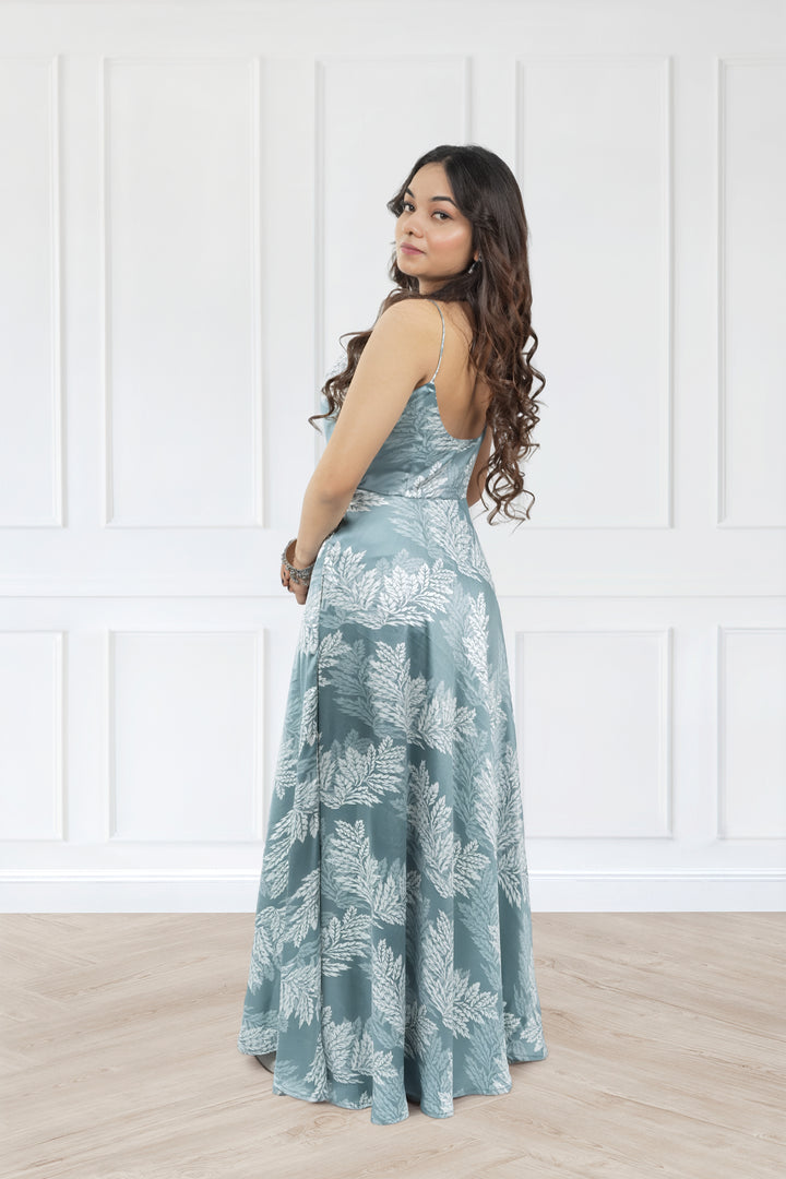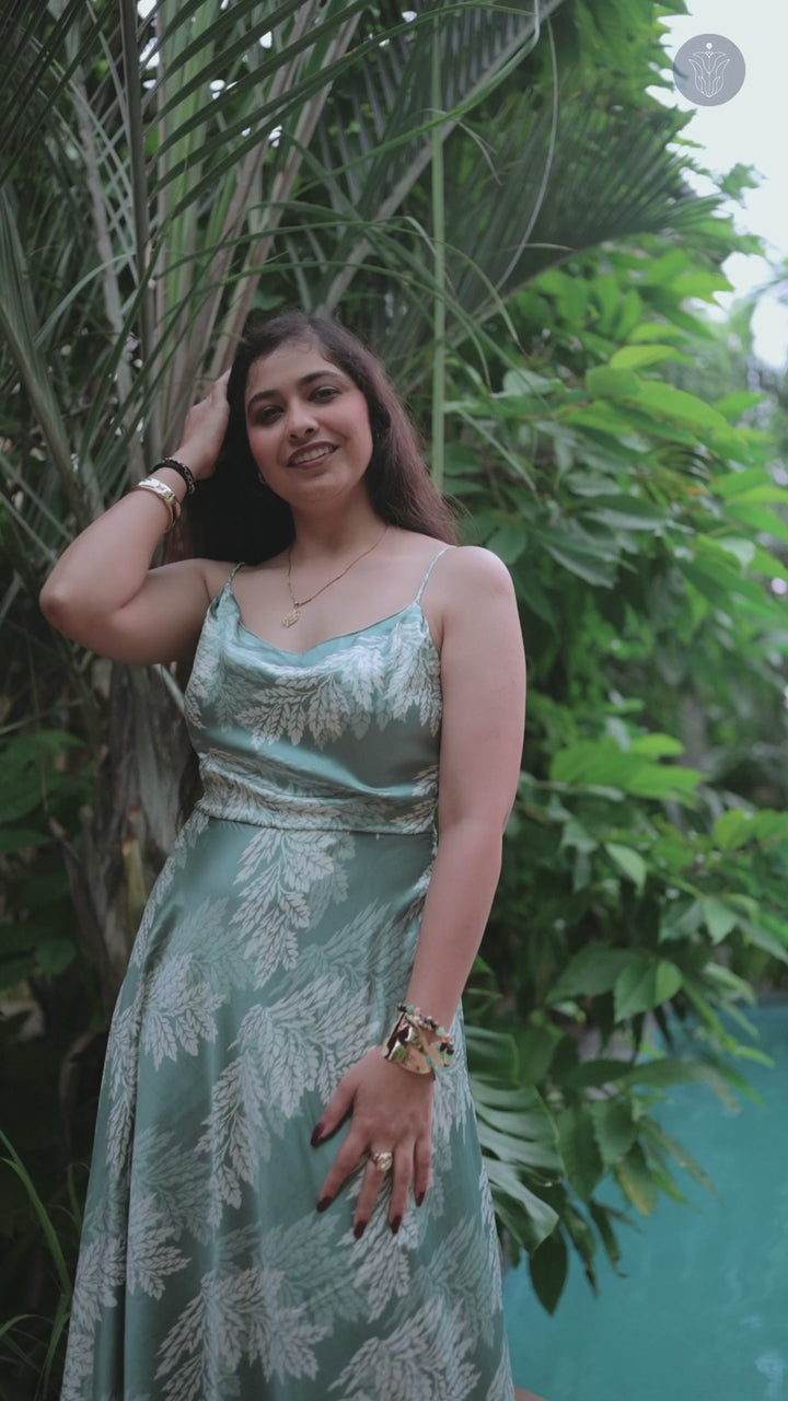 The Sage Mist Satin Maxi Dress blends elegance with effortless sophistication. Crafted from lustrous modal satin, this dress features a soft cowl neckline and a beautifully flowing silhouette that drapes like liquid. The subtle sage base adorned with leaf-pattern motifs makes it ideal for evening dinners, celebrations, or any occasion where you want to look refined with minimal effort. A concealed side zip ensures a seamless, flattering fit.