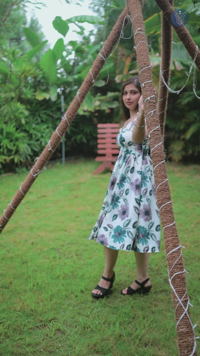 The Teal Bloom Midi Dress brings a refreshing, feminine charm with its soft floral print and flowy silhouette. Designed with slim shoulder straps and a beautifully gathered waistline, this dress delivers comfort without compromising on elegance. The flattering fit-and-flare structure paired with a smooth side zip ensures a seamless, polished look perfect for brunches, outings, vacations, or summer evenings.
